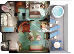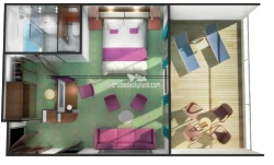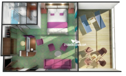 Cabin size ranges from 528 to 690 square feet with 185 to 280 square foot balconies. There is no hot tub on Deck 13 balconies for this category. Stateroom 10000 and staterooms on deck 11 and deck 13 DO NOT have a guest bath.Stateroom Cabin Perks
