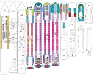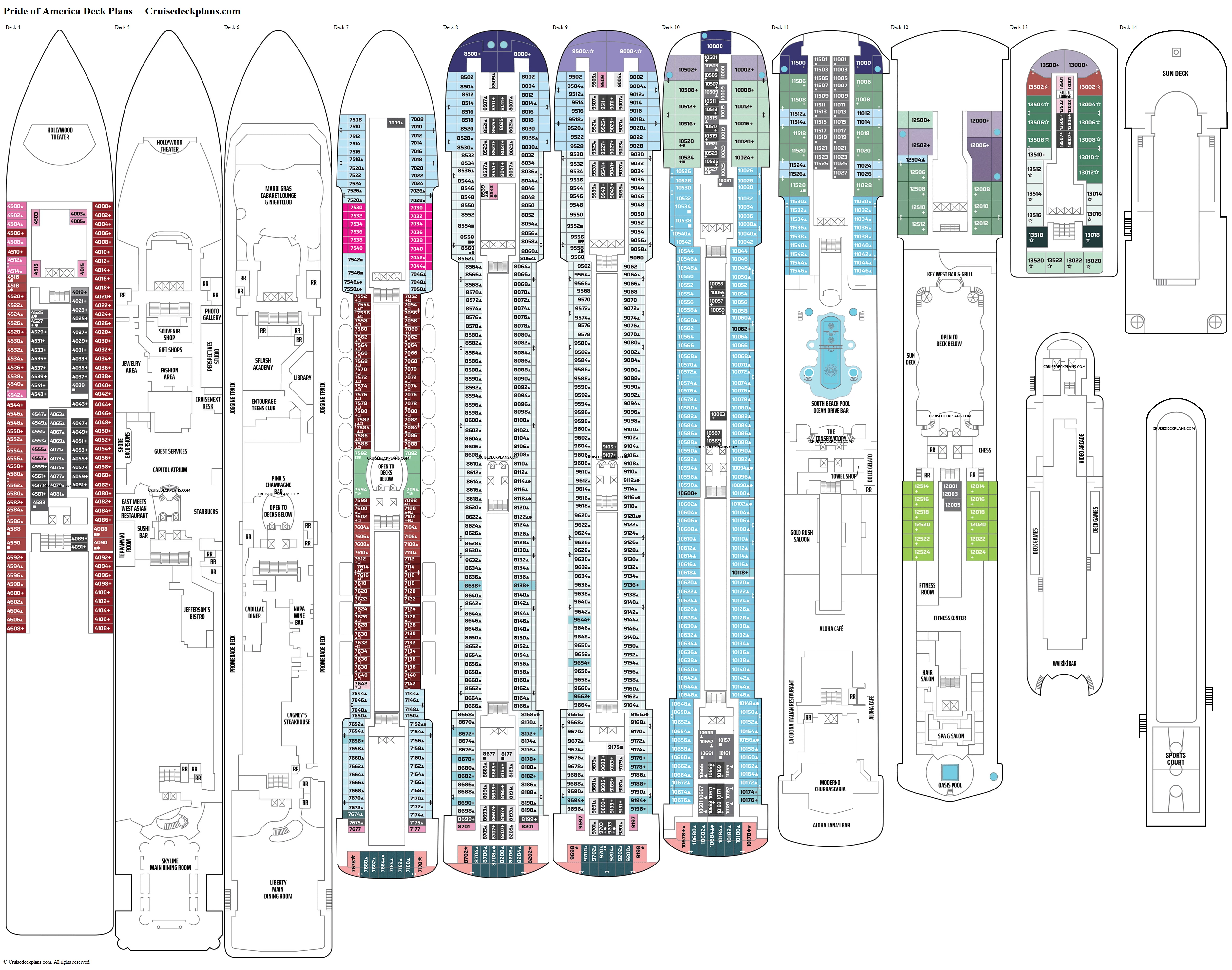 Built in 2005, the Norwegian Cruise Line Pride of America internal volume is 81K tons and has 1109 staterooms for up to 2662 passengers served by 800 crew. There are 14 passenger decks, 8 with cabins. You can expect a space ratio of 30 gross tons per passenger on this ship. On this page are the current deck plans for Pride of America showing deck plan layouts, public venues and all the types of cabins including pictures and videos.
