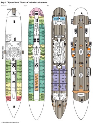 Built in 2000, the Star Clippers Royal Clipper internal volume is 5K tons and has 112 staterooms for up to 224 passengers served by 106 crew. There are 4 passenger decks, 3 with cabins. You can expect a space ratio of 22 gross tons per passenger on this ship. On this page are the current deck plans for Royal Clipper showing deck plan layouts, public venues and all the types of cabins including pictures and videos.