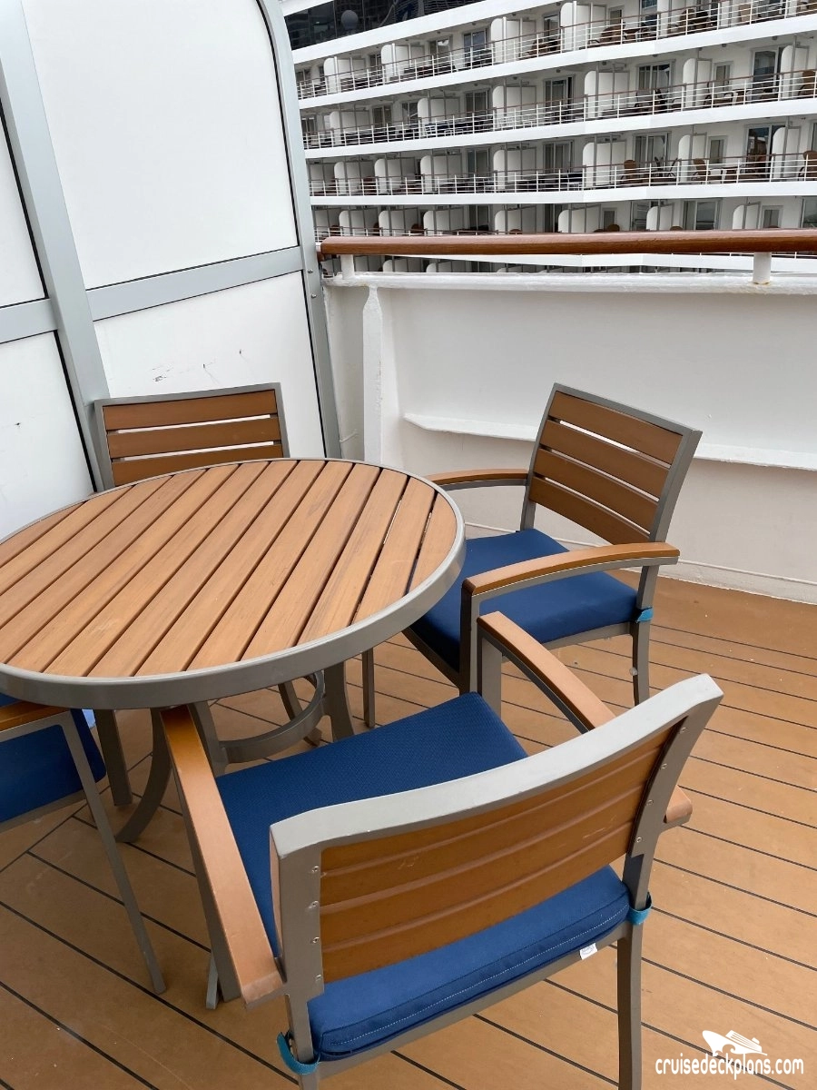 The balcony of these cabins is on the front part of the ship and there is not a lot of wind protection. This will make the balcony unusable at times when the wind is heavy while the ship is underway. In such cases the furniture may need to be tied down.Stateroom Cabin Perks