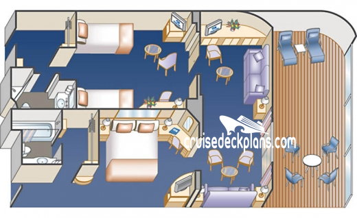 - A mini-suite and interior stateroom that are connected by a large living room with two sofa beds. Large Private balcony- Two bathrooms (one with tub & shower
