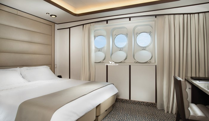 Cabins on deck 2 have three portholes and range from 210 to 240 square feet. Cabins on decks 3 and 4 range from 235 to 250 square feet.Stateroom Cabin Perks