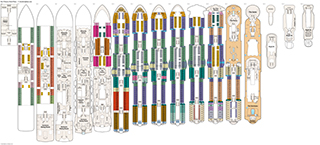Click deck pictures to go to individual cruise deck plan pages where you can see all the public areas, venues and stateroom cabins categories for each deck.