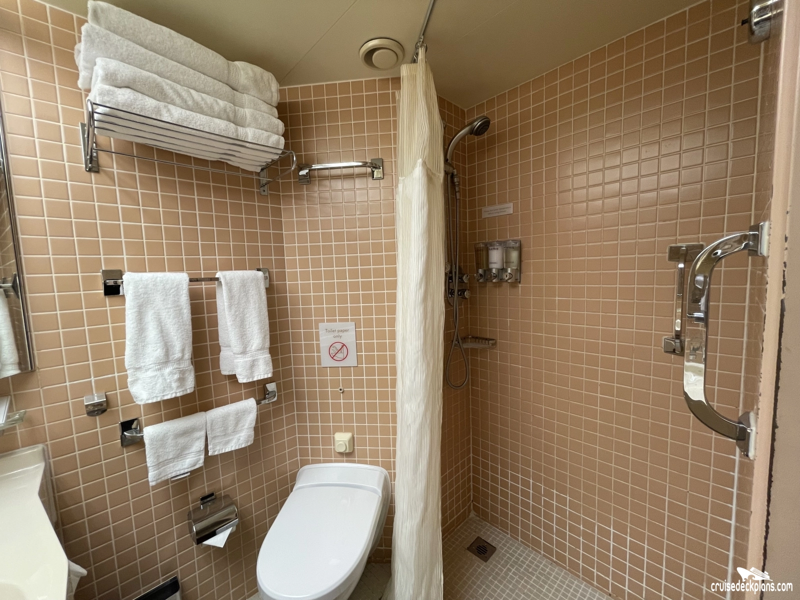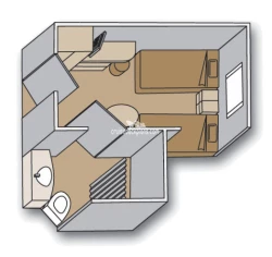 Category G has two portholes. Category HH is fully obstructed. Category H is partially obstructed. Cabins on deck 3 have windows looking out onto promenade deck and people walking by can view into the cabin when lights are on in cabin. In 2018 tubs were removed from the following cabins: Lower Promenade Deck: D3331 - D3370, Main Deck: C2564 - C2647Stateroom Cabin Perks
