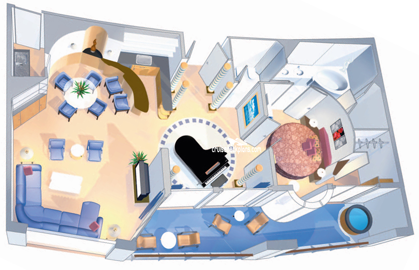 Stateroom Cabin Features: - Separate bedroom with king-size bed - Private balcony with hot tub - Living room with queen-size sofa bed - Dining table - Baby grand piano - Entertainment center - Wet bar - Private bath with whirlpool tub, shower, vanity area - Walk-in closet - Mini bar - Television, safe, radio, phone, hairdryer