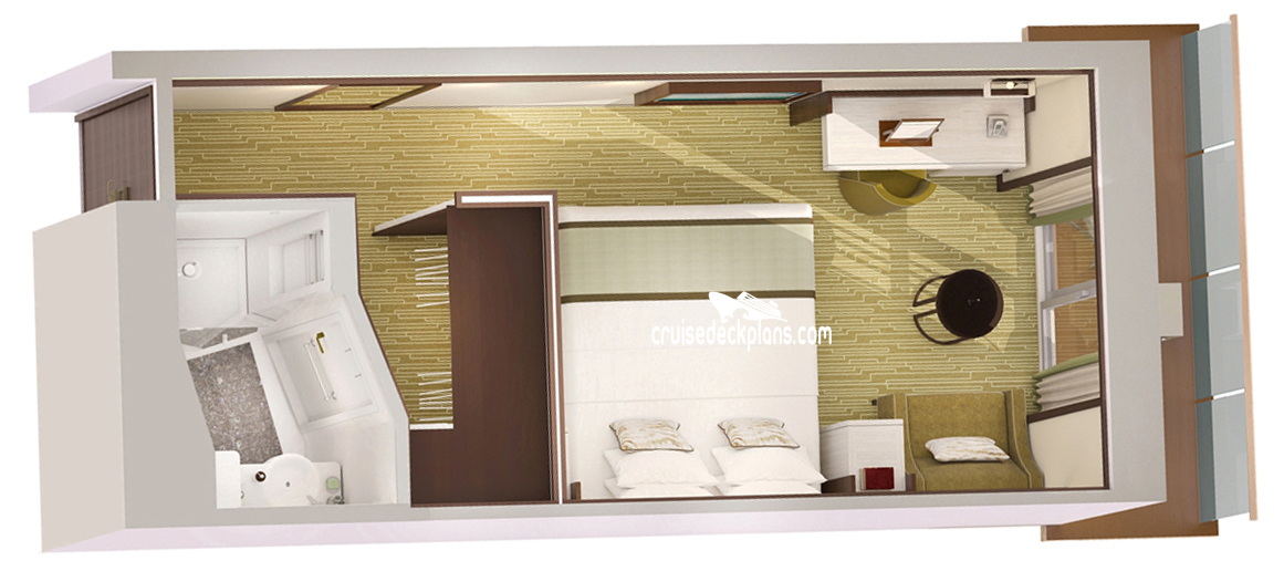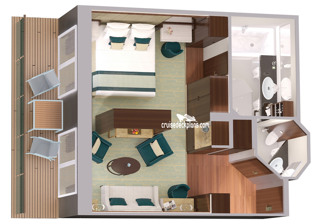 Stateroom Cabin Features: - A spacious suite with balcony includes all the amenities of a mini-suite - Plus incredible premiums including: two 42" flat screen televisions - Separate bathtub and shower - Marble floors and countertops - Access to the dedicated Concierge Lounge - A soundstation dock for your iPod - Complimentary laundry and professional cleaning services - Web access in the Internet Cafe - In-room safe - Refrigerator - 37 inch flat screen tv with movies - Cable and satellite programing - Hand-held adjustable massage shower head - Hair dryer - Bathroom sundries.