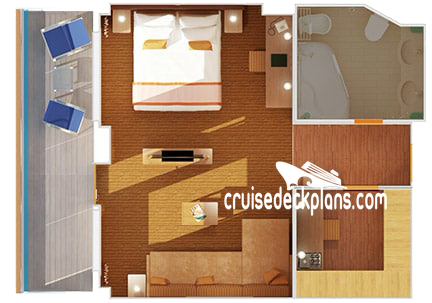 Stateroom Cabin Features: - Mirror and small table in entry - Dressing area with closets, vanity and bureau space - Large bathroom with twin sinks,whirlpool tub/shower combo, bidet and toilet - Twin beds that convert to king, 2 end tables with lamps - Large desk with mirror and chair - Flat screen tv - Sitting area with 2-armchairs, coffee table, end table, and double sofa bed - Safe - Mini fridge with items for purchase - Hairdryer - Telephone - Large private balcony with lounge chair, patio chairs and table