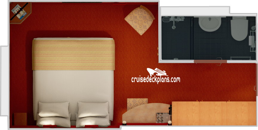 Stateroom Cabin Features: - Twin beds that convert to queen - Large balcony - Sitting area with armchair and coffee table - Sofa - Dressing area with vanity - Two large closets - Wall safe - Refrigerator - Mini bar - Private bath with whirlpool tub and shower - Phone - Television - Hair dryer - Note: Handicap modified cabins do not have sofa, whirlpool tub or coffee table.