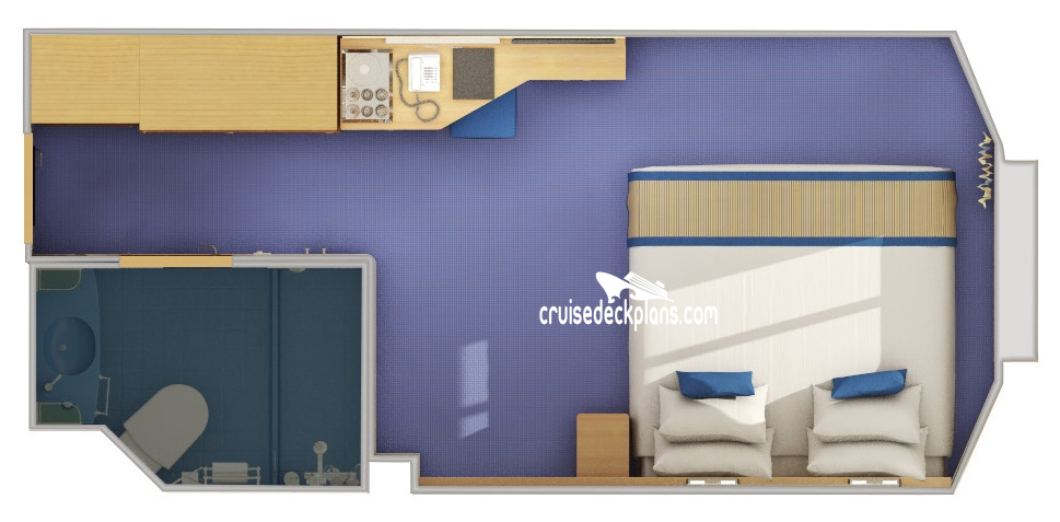 Stateroom Cabin Features: - Twin beds that convert to king - 221 square foot separate bedroom - Large private balcony - Living area is 291 square feet with sofa bed and 2 upper - Safe - Refrigerator - Mini bar - Private bath with whirlpool tub and shower - Phone - Television - Hair dryer - Balcony has 3 patio chairs and table.