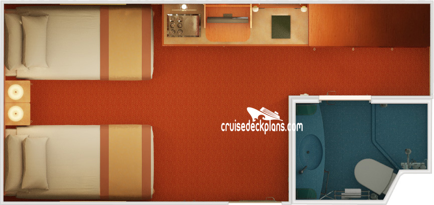 Stateroom Cabin Features: - Large closet with full-length mirror in entry, safe - Bathroom 1: Glass door shower,toilet, sink and vanity - Bathroom 2: Glass door whirlpool tub/shower combo, toilet, sink and vanity - Separate bedroom with flat-screen tv, 2 end tables with USB plugs, desk with chair, storage space - Twin beds that convert to king, US and EU plugs - Living area has L-shaped sofa bed, 2 armchairs, and 1 pull down trundle bed - Large retractable-shade windows, flat-screen tv - Thermostat control - Plenty of table space, mini refrigerator - Large private balcony with 2 lounge chairs, 2 cushioned chairs, dining table and 4 chairs.
