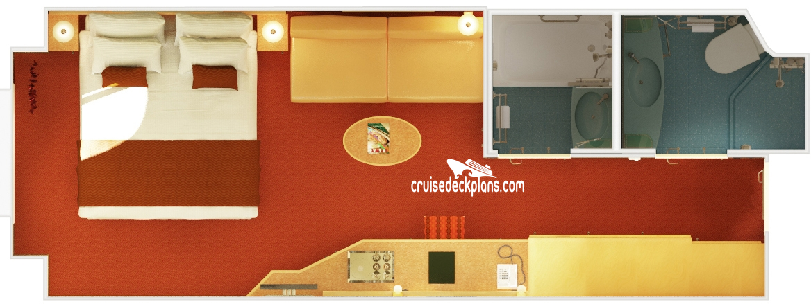 Stateroom Cabin Features: - Twin beds that convert to king - Large private balcony - Sitting area with 2-armchairs and coffee table - Desk - Double sofa bed - Dressing area with vanity - Walk-in closet - Safe - Refrigerator - Mini bar - Private bath with whirlpool tub and shower - Phone - Television - Hair dryer - Balcony lounge chair - Patio chair and table - Pillow menu - Bathrobes.