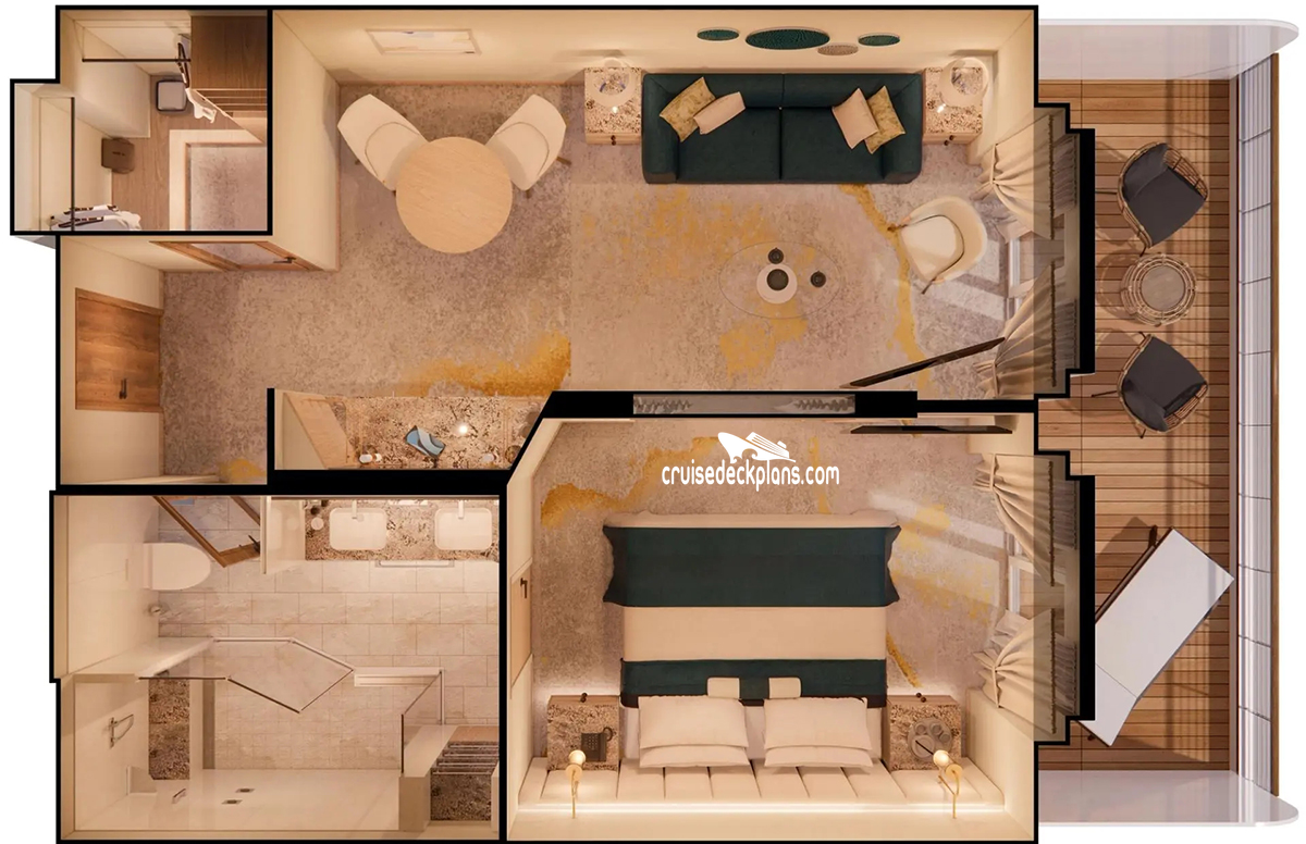 Stateroom Cabin Features: - Large private veranda with teak furniture - Spacious living room with TV - Custom wool carpets - Walnut floors - Cabinetry and Swarovski chandelier - Dining area with panoramic ocean views - Separate study - Custom built-in bar - Large bedroom with queen-size bed or twins - His and hers walk-in closets and TV - Master bath with jacuzzi, ocean view, crystal sconces and Calacatta marble floors - Separate shower and bidet - Guest bathroom - Turndown service with handmade truffles - Pillow menu (selection from a variety of pillow types) - Afternoon canapes - Nespresso coffee maker - Binoculars - Complimentary unlimited standard WiFi - In-suite safe - Interactive tablet for news, updates, and reservations - Hair dryer - Hair iron (available upon request)