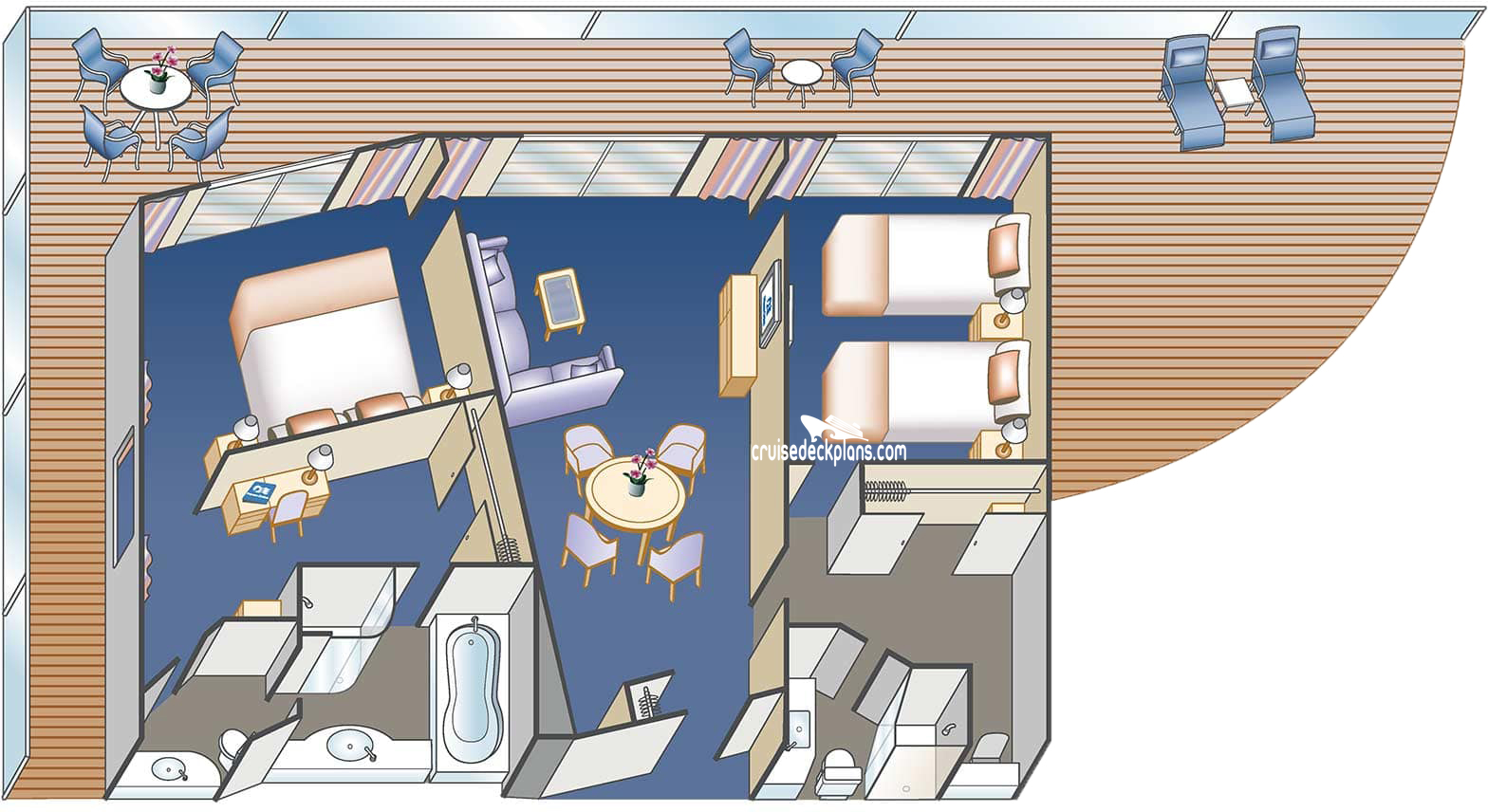 Stateroom Cabin Features: - Balcony - Luxury balcony furniture including dining table for four, large day bed loungers, exterior bar with mini fridge, TV - Floor-to-ceiling sliding glass doors - Living area with sofa (Sleeps at least 1) - Side table - Lounge Chair - Coffee Table - Dining table for four - Master bedroom with queen bed - Master bath with tub and separate shower - Spacious closet - Vanity/desk in master bedroom - Second bedroom with queen (or two twins), lounge chair and ottoman, closet, vanity/desk, bathroom with shower - 2 refrigerators (one in living area and one on balcony) - Hair dryer - Security safe - Phone.
