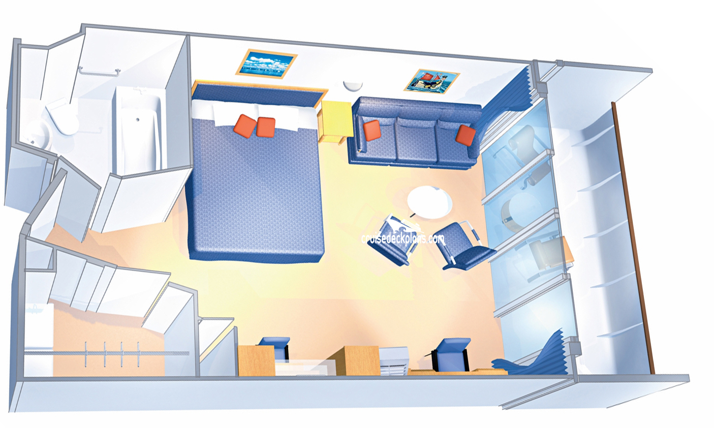 Stateroom Cabin Features: - Separate bedroom with king-size bed - Private balcony - Living room with queen-size sofa bed - Dining table - Baby grand piano - Entertainment center - Wet bar - Private bath with whirlpool tub - Shower - Vanity area - Walk-in closet - Mini bar - Television - Safe - Radio - Phone - Hairdryer.