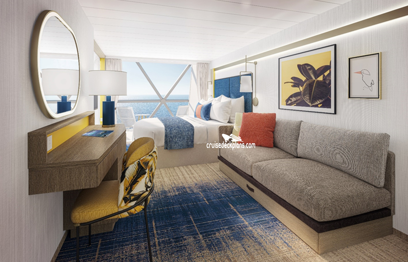 Stateroom Cabin Features: - Two-decks-high stateroom with panoramic views - Main level features a bedroom with closet and vanity - Two twin beds that convert to Royal King - Dining area with wet bar - Piano - Living room with sofa that converts to double bed - Bathroom with shower and integrated bench - Master bedroom features a King size bed with Matermoll Summer Mattress - Bathroom with tub, shower, two sinks, half bath (toilet compartment with sink) - Walk-in closet - Vestibule with mini bar and two lounge chairs (retreat) at the top of the stairs - Vestibule serves as added privacy - and has no direct view to the bedroom - Interactive flat-screen TVs - IPod docking station - Mini-safe - Phone - Hairdryer - The Private balcony features whirlpool and dining area, bar with sink