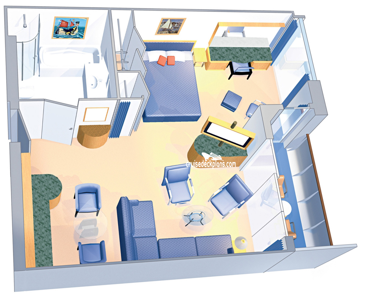 Stateroom Cabin Features: - Separate bedroom with king-size bed - Private balcony with hot tub - Living room with queen-size sofa bed - Dining table - Baby grand piano - Entertainment center - Wet bar - Private bath with whirlpool tub - Shower - Vanity area - Walk-in closet - Mini bar - Television - Safe - Radio - Phone - Hairdryer.