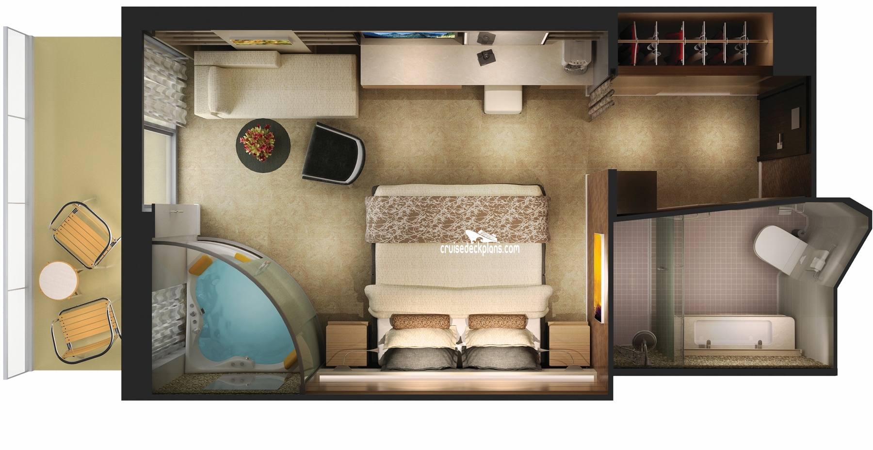 Stateroom Cabin Features: - Separate living room - Dining area and guest half bathroom - Floor to ceiling windows - Extra spacious wraparound private balcony - King-size bed with pillow top mattress - Separate luxury shower, oversize tub, two vanity sinks, water closet - Large wardrobe dressing area with full closet - Tv,refrigerator, hairdryer, safe - Butler and concierge service is available.