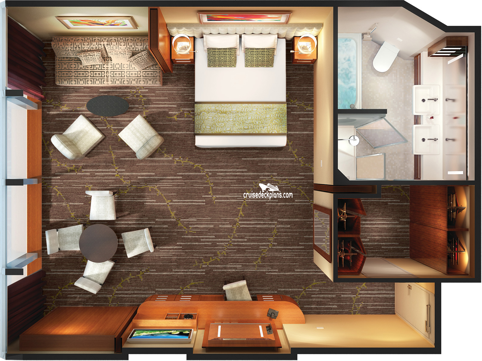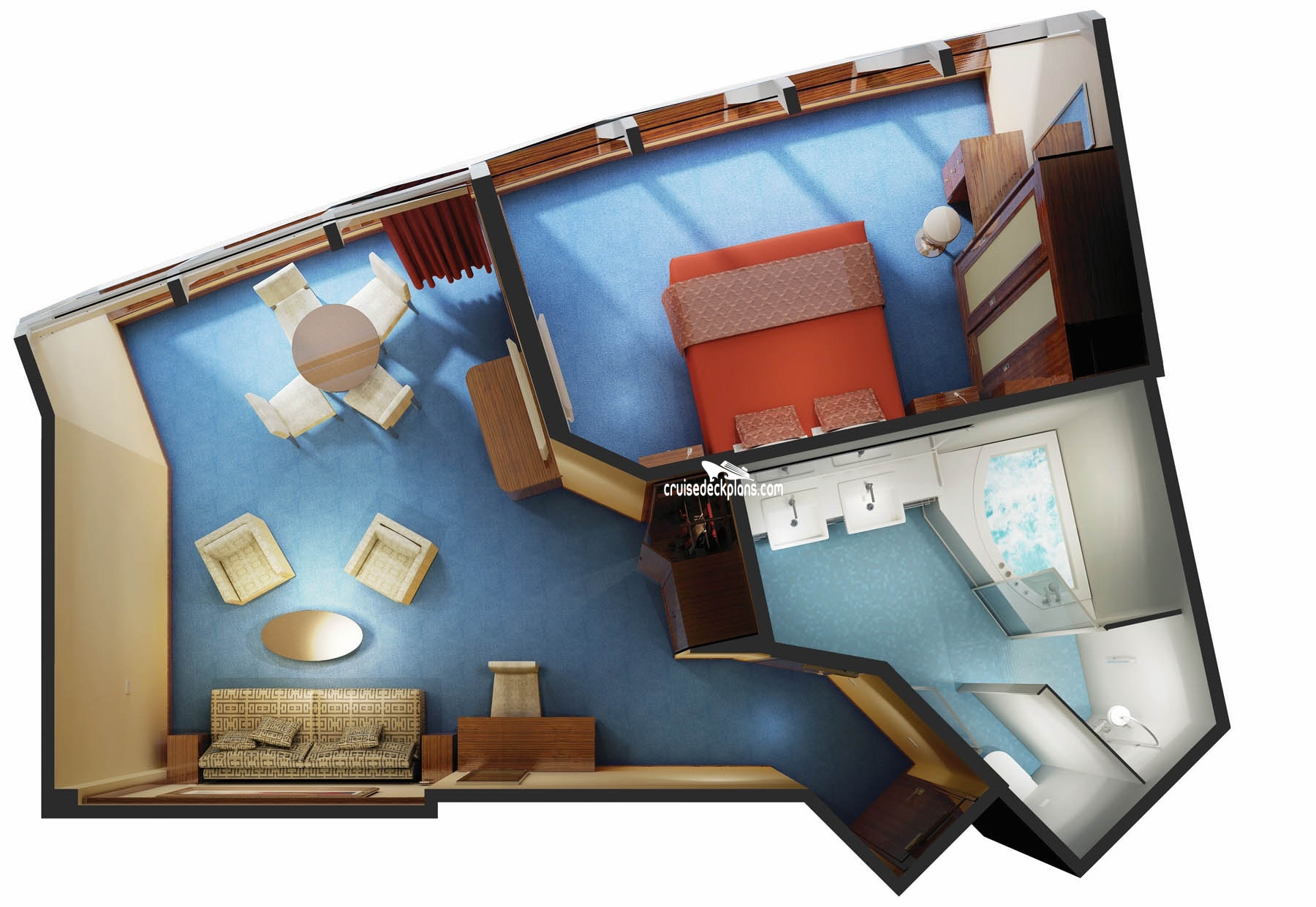 Stateroom Cabin Features: - Panoramic views - Roof terrace and private garden and open-air dining - Jacuzzis - Totally private sunning and relaxation areas - Living room, dining room - Three separate bedrooms, each with private luxury bath - Safe, VCR, CD library, LCD television and DVD player - Master bath has a full bath with whirlpool and separate shower - Hairdryer