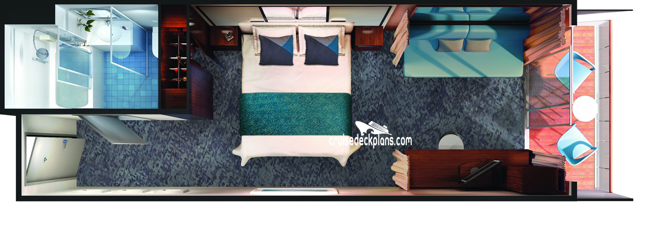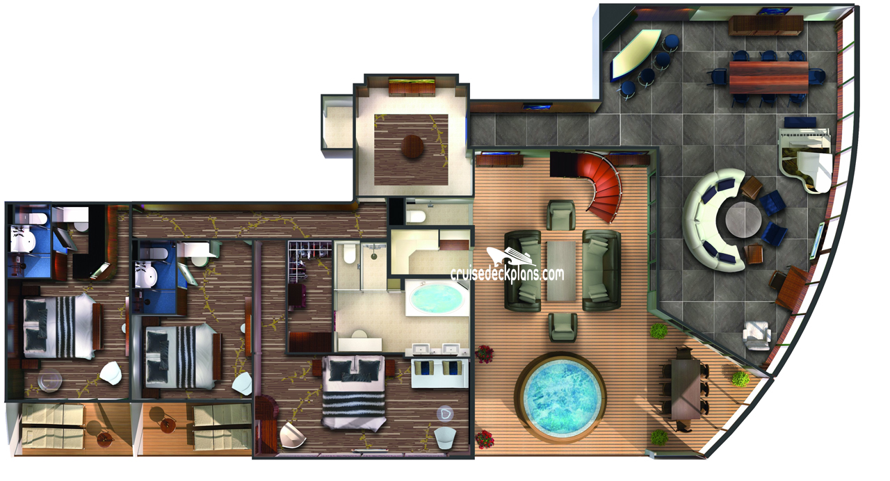 Stateroom Cabin Features: - Separate bedroom with king-sized bed - Private bathroom with whirlpool tub and separate shower - Floor to ceiling glass doors that open to private balconies - Two additional bedrooms with private baths and showers - Living room, dining room - CD/DVD library - Minibar, refrigerator, safe - Television, music console, phone, hairdryer.