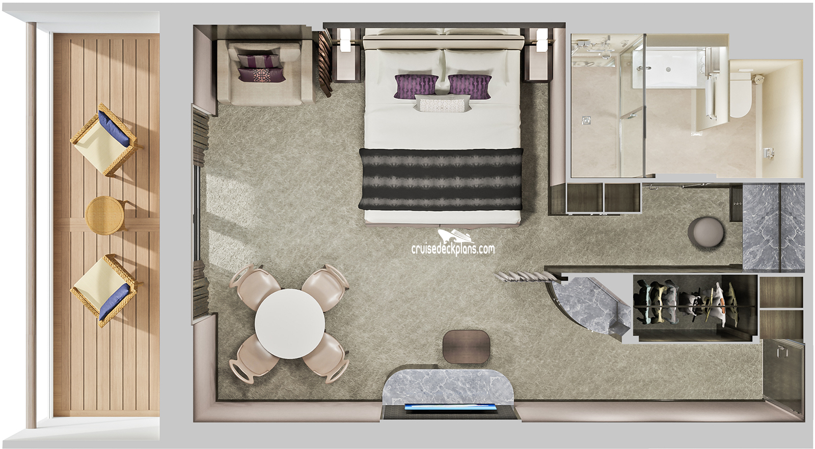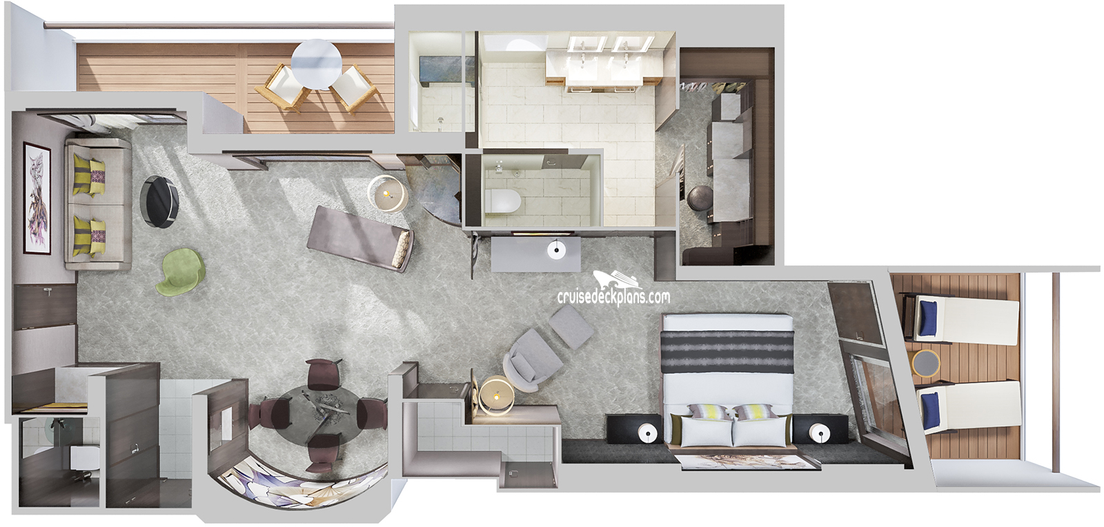 Stateroom Cabin Features: - Separate bedroom with king-sized bed - Private bathroom with whirlpool tub and separate shower - Floor to ceiling glass doors that open to private balconies - Two additional bedrooms with private baths and showers - Living room, dining room - CD/DVD library - minibar, refrigerator, safe - Television, music console, phone, hairdryer.
