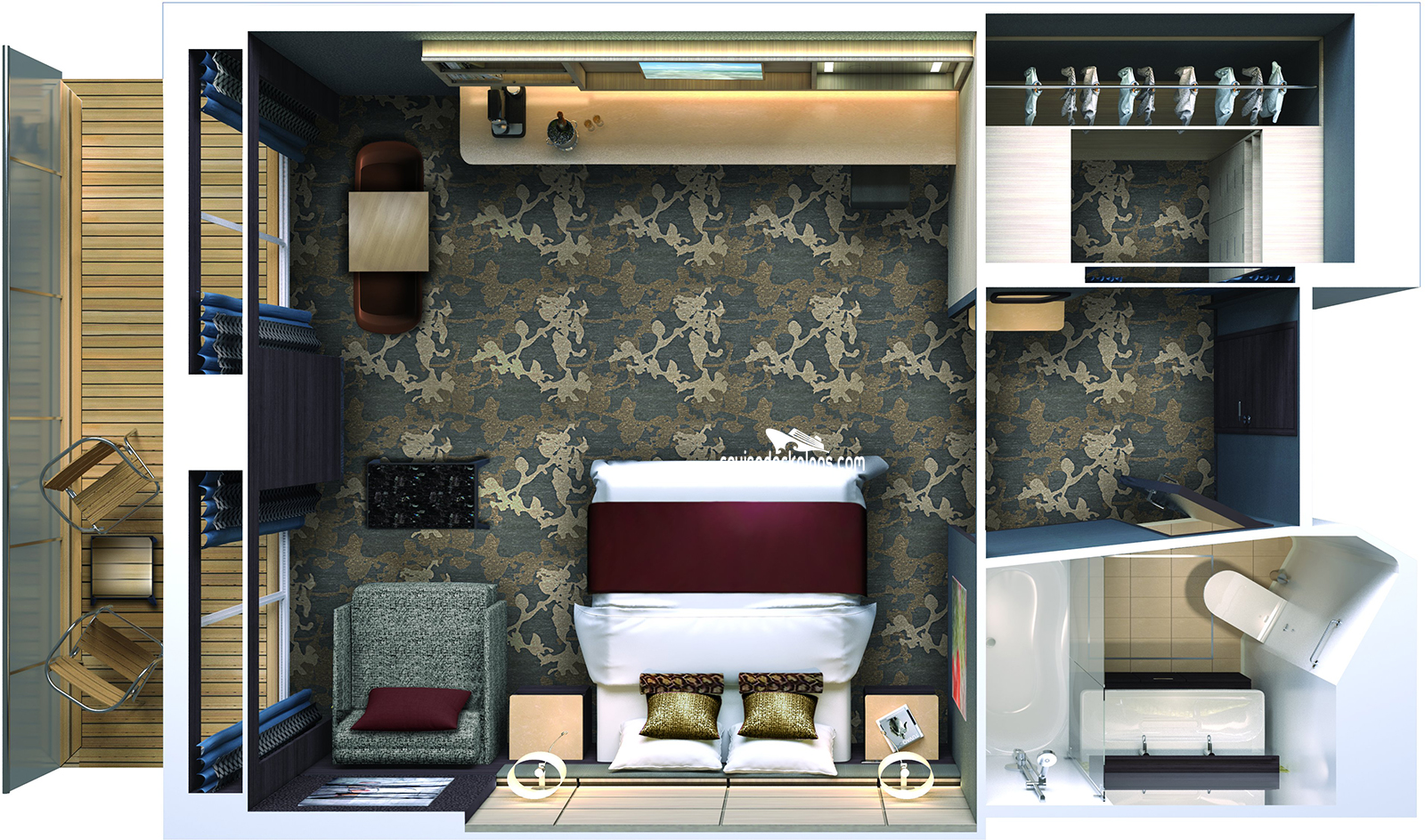 Stateroom Cabin Features: - Separate living room - Floor to ceiling windows - Dining room - Three bedrooms (two with king-size bed, and one with double sofa bed) - Three bathrooms - Guest half-bath - Extra spacious wraparound private balcony - Tv,refrigerator, hairdryer, safe - Butler and concierge service is available.