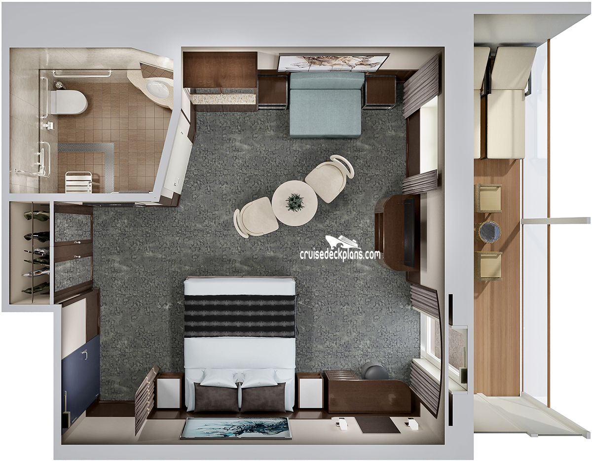 Stateroom Cabin Features: - Living room - Private balcony with hot tub - Dining room - Separate bedroom with queen-size bed - Luxury bath with tub & shower - Television, refrigerator, safe, hairdryer.