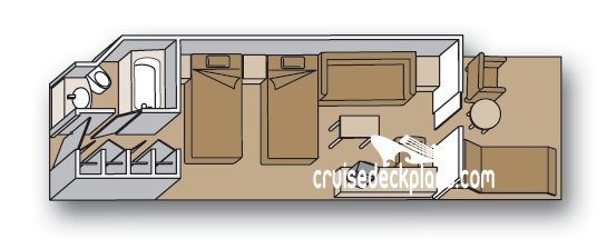 Stateroom Cabin Features: - Bedroom with king-size bed - Private bath with oversized whirlpool & shower - Hairdryer - Dressing room - Floor to ceiling windows that open to private balcony - Living room with sofa bed - Dining room - Pantry - Guest bath - Refrigerator, television, DVD player, safe - Multi-channel music, phone.