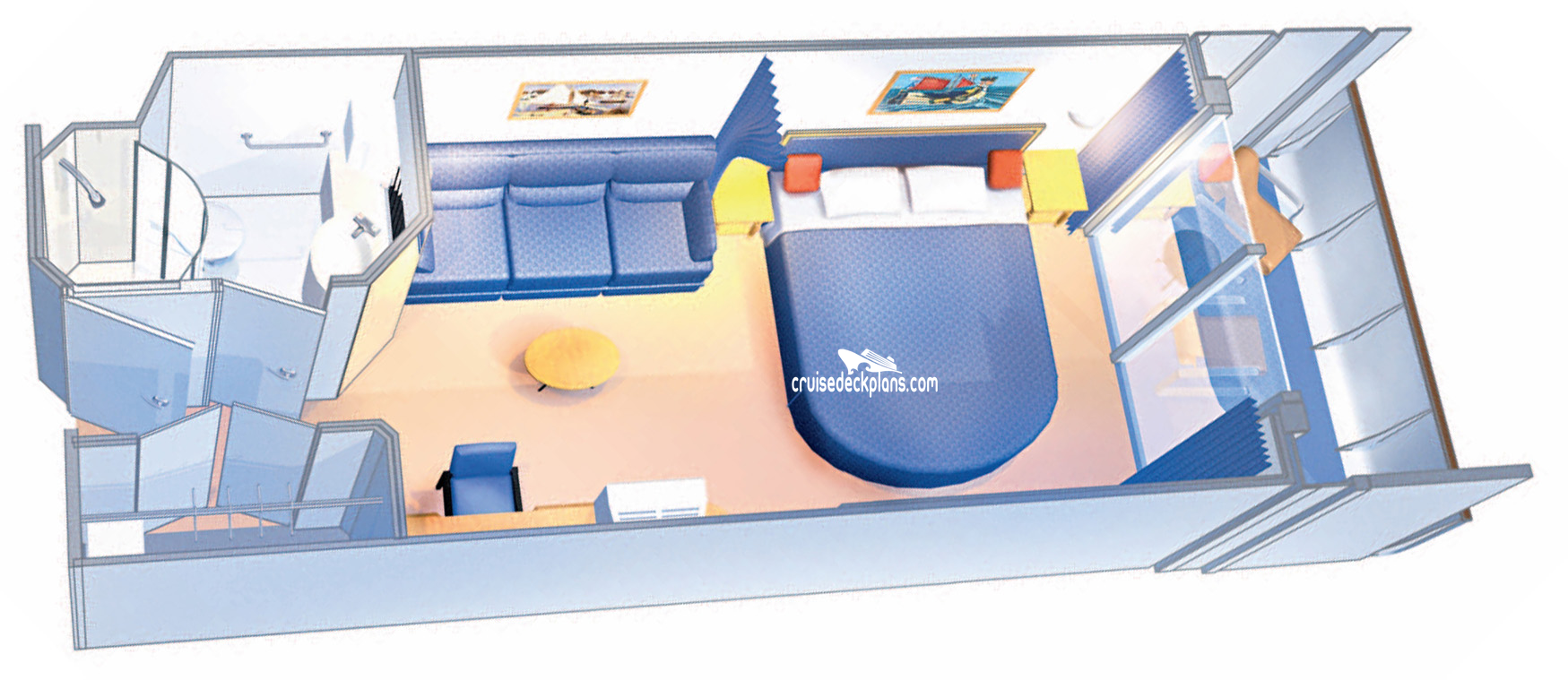 Stateroom Cabin Features: - Separate bedroom with king-size bed - Private balcony - Living room with queen-size sofa bed - Dining table - Baby grand piano - Entertainment center - Wet bar - Private bath with whirlpool tub - Shower - Vanity area - Walk-in closet - Mini bar - Television - Safe - Radio - Phone - Hairdryer.