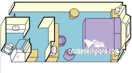 Stateroom Cabin Features: - Queen bed - Separate sitting room - Double sofa bed - Dining area - Large balcony - Two televisions - Personal computer - A DVD/CD player - Refrigerator - Safe - Phone - Hair dryer - Wet bar - Walk-in closet - Bathroom with corner tub (equipped with whirlpool jets) - Multi-directional brass fitting shower.