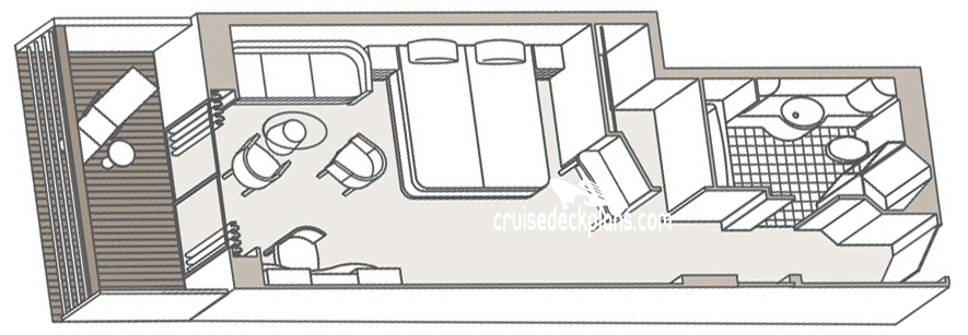 Stateroom Cabin Features: - European two twin beds that convert to king-size - Two bedrooms - Two baths - One bath marble-appointed with full size tub and shower - Private balcony - Walk-in closet - Hairdryer - Television - Refrigerator - Safe - Phone - Sitting area - Vanity.