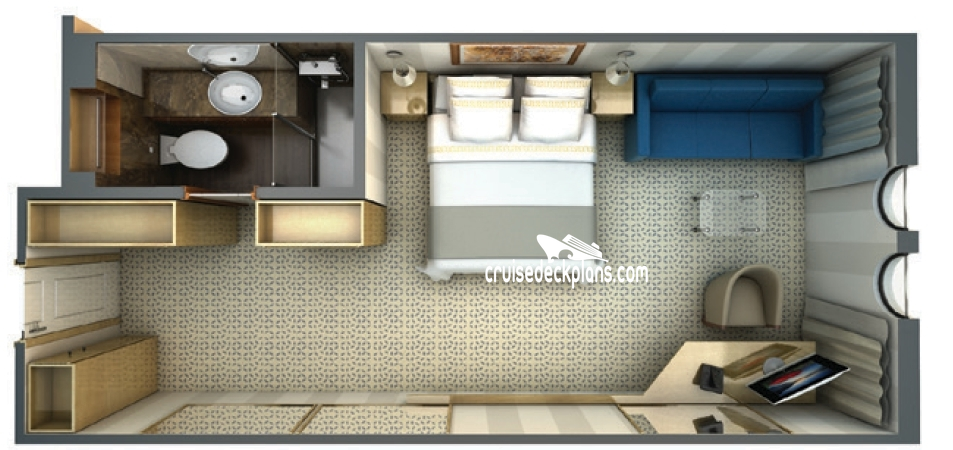 Stateroom Cabin Features: - Two lower beds converting to queen-size bed and a sitting area with a sofa - Balcony - Floor-to-ceiling windows - Individually controlled air-conditioning - In-room music system - Ample wardrobe space - Three-sided mirrors - Safe - Mini-bar - TV - Bathroom with tub baths & shower.