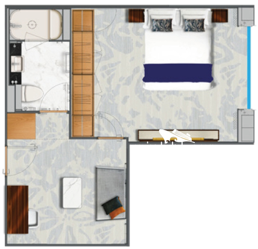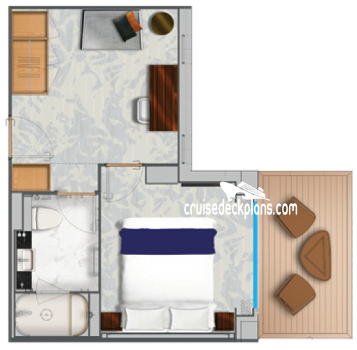Stateroom Cabin Features: - Floor-to-ceiling windows - Wrap-around balcony - Separate entry - Separate dining area - Separate living area - Guest powder room - King bed (convertible to two XL twin beds) - Double walk-in mosaic glass shower with rain head and body jets