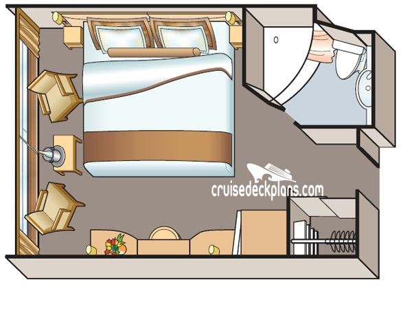 Stateroom Cabin Features: - Hotel-style beds 79 inches x 63 inches (with optional twin-bed configuration) - French balconies (floor-to-ceiling sliding glass doors) - Large private bathroom with bathtub, shower and premium bath products - Bathrobe and slippers available upon request - Telephone, refrigerator, safe, hair dryer & bottled water replenished daily - Individual climate control - Sofa in seating area - Space under bed for storing suitcases - Walk-in closet with wooden hangers - Voltage: 220V and 115V in stateroom - Two Sony 26-inch flat-panel TVs with premium entertainment package including: CNBC, CNN, FOX, National Geographic, MGM Movies, Sky Cinema and "View From the Bridge"