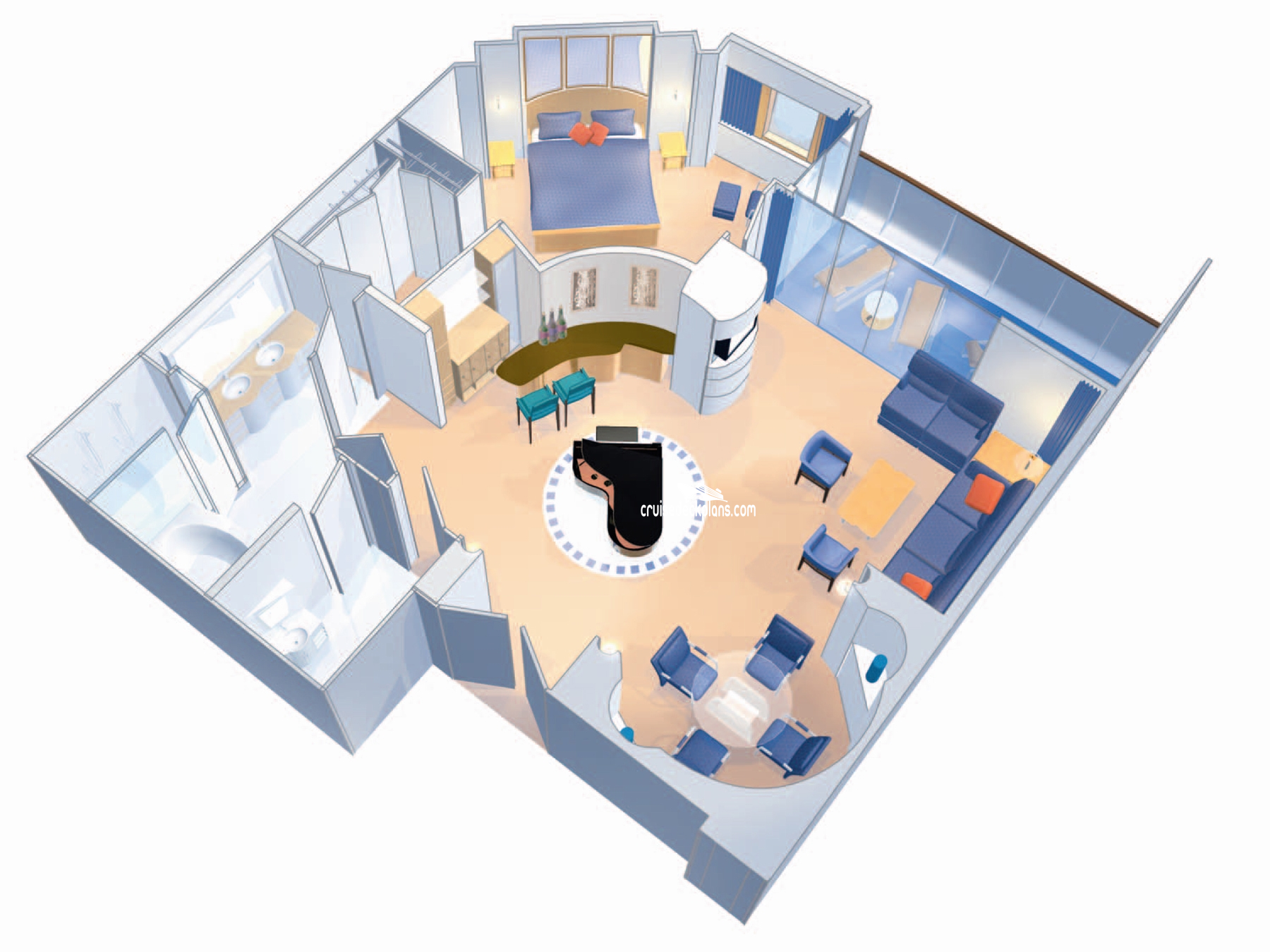 Stateroom Cabin Features: - Separate bedroom with king-size bed - Private balcony - Living room with queen-size sofa bed - Dining table - Baby grand piano - Entertainment center - Wet bar - Private bath with whirlpool tub - Shower - Vanity area - Walk-in closet - Mini bar - Television - Safe - Radio - Phone - Hairdryer.