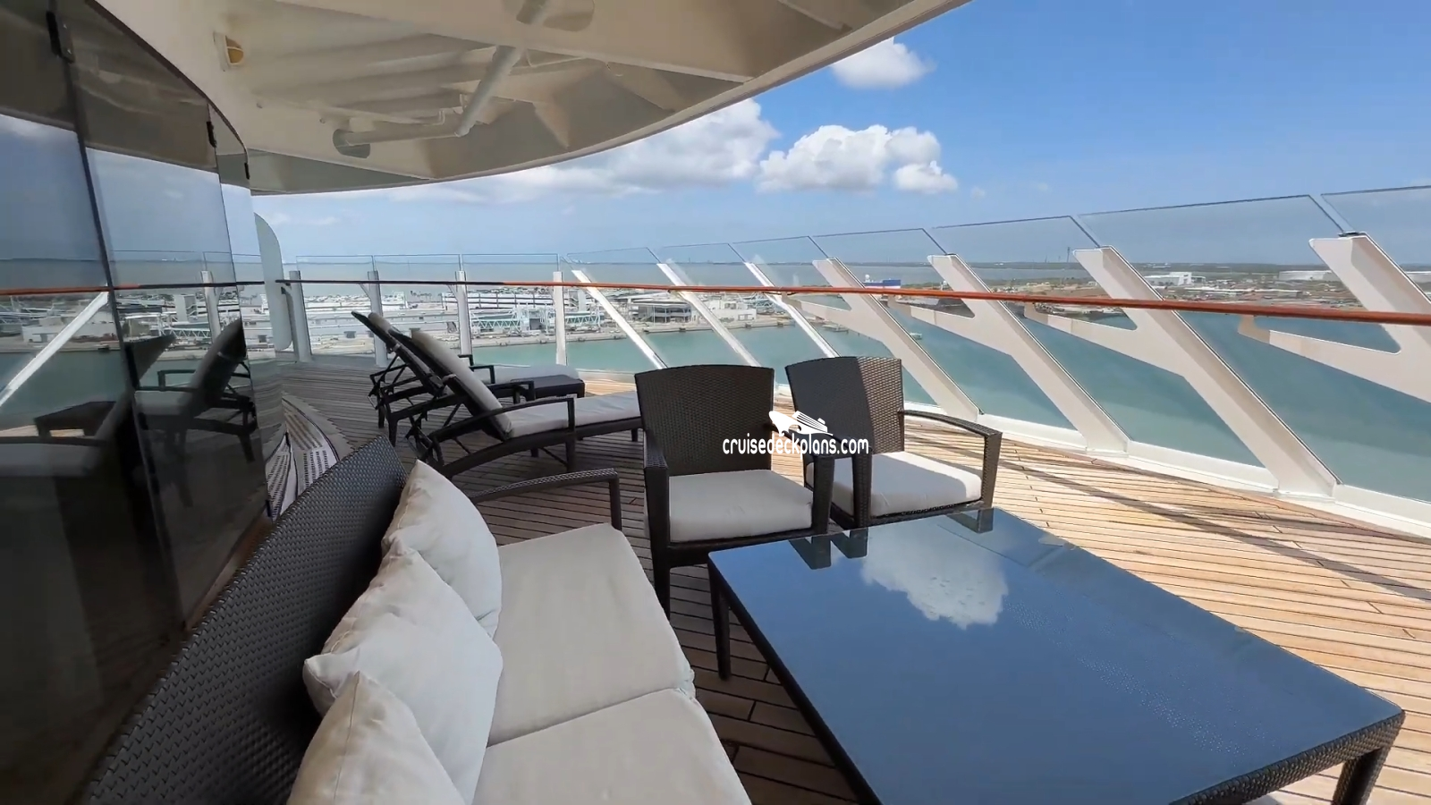 Concierge Service / Priority Check In / Priority Tender Boarding / Dining in the Stateroom / Exclusive Lounge / Priority Dining Reservations / Exclusive Outdoor Lounge / Thick Cotton Robes / Pillow Menu / Sealy Posturepedic Euro-top mattress / Frette 100% Egyptian cotton linens / 2 LCD 42 inch HD flat screen Tvs / Ipod docking station / Enhanced line of H20 Plus spa products / Media library / Pre-arrival concierge services /