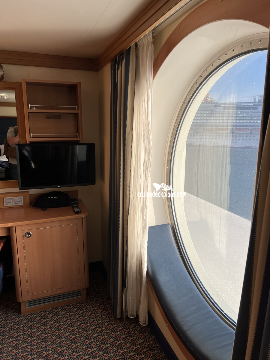 - One large porthole window with built in seating (nearly 5ft in diameter)