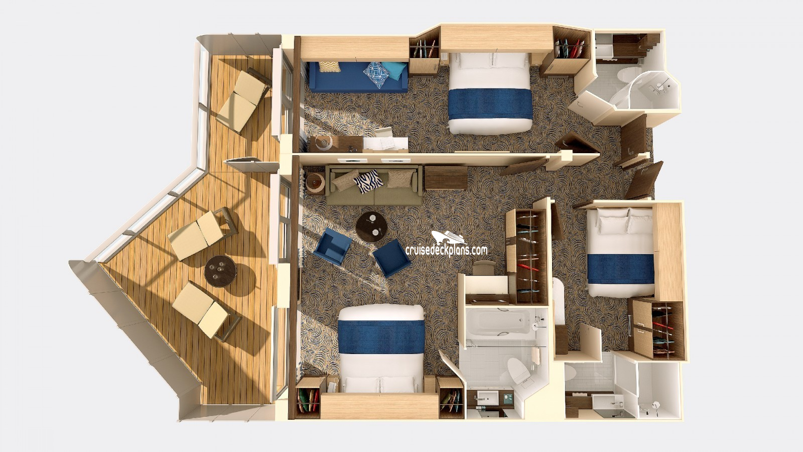 This suite can be combined with nearby balcony and interior cabins to create one large family connected stateroom with 3 bedrooms, 3 bathrooms and a balcony for all your family needs. Sleeps 8 to 10 guests. Total square footage is 575 sq ft plus 216 sq foot balcony. You can not book this category online.
