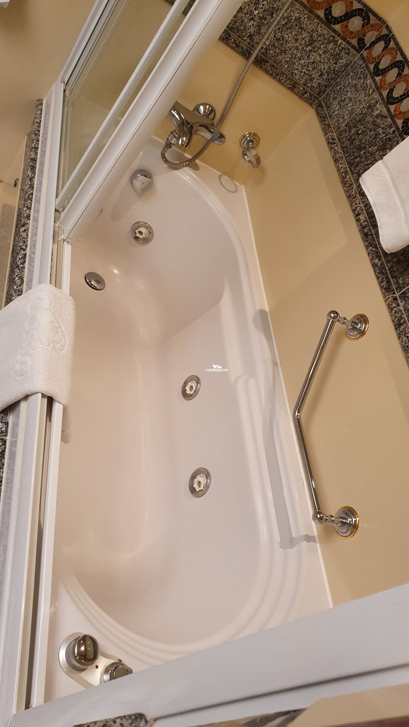 Butler Service / Priority Check In / Priority Debarkation / Afternoon Canapes / Priority Dining Reservations / Thick Cotton Robes / Pillow Menu / All benefits of premium cabins / Free service in your cabin / Extra 10% discount on your next cruise / Personal valet / Restaurant reserved exclusively for Suite guests / All-day access to the spa / Bottle of Ferrari sparkling wine / Jacuzzi, baths salts, bath robe and slippers / Choice of pillows (pillow menu) /