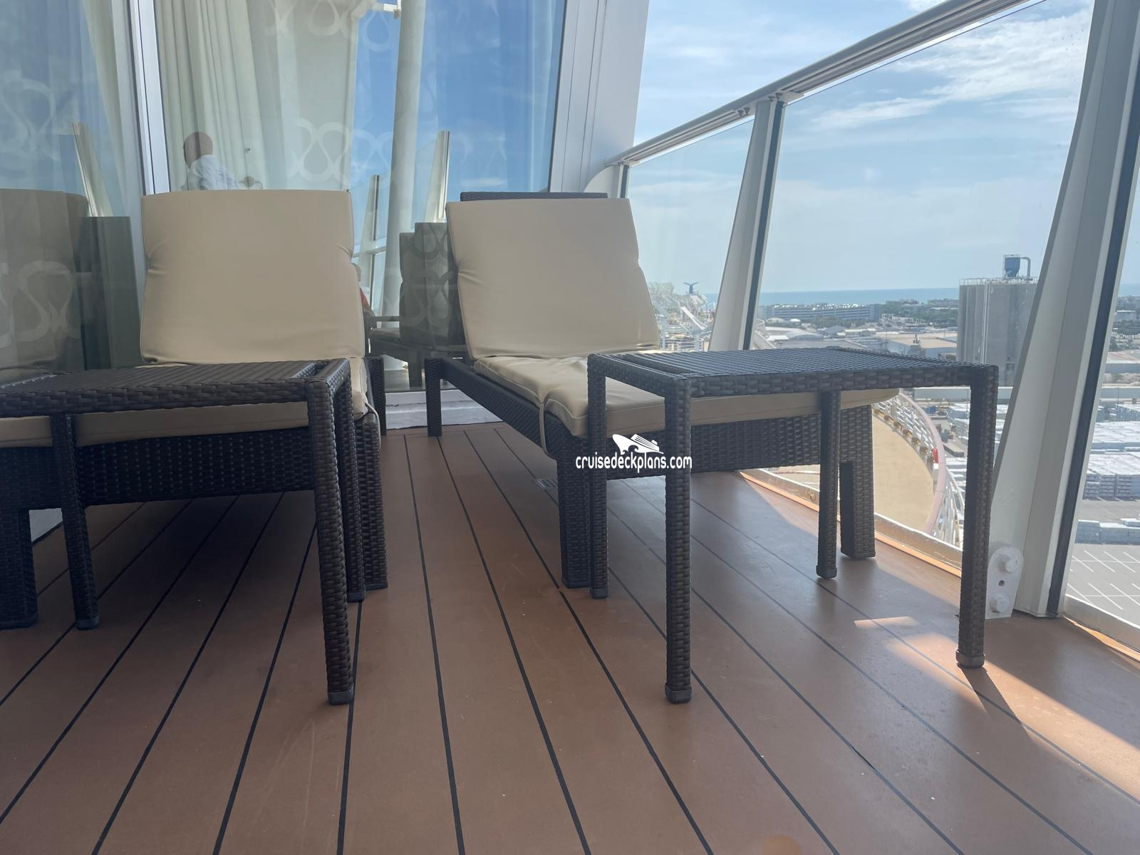 Concierge Service / Priority Check In / Priority Debarkation / Priority Tender Boarding / Reserved Show Seats / Dining in the Stateroom / Exclusive Lounge / Exclusive Full Breakfast Restaurant / Thick Cotton Robes / Pillow Menu / All day access to Coastal Kitchen on Icon, Oasis and Quantum class ships / Specialty Bottle Water / 1 day pass to Spa Thermal Room / Luxury Bath Amenities / Luxury Pillowtop Matress / Suite only sun deck / Suite only beach on private island