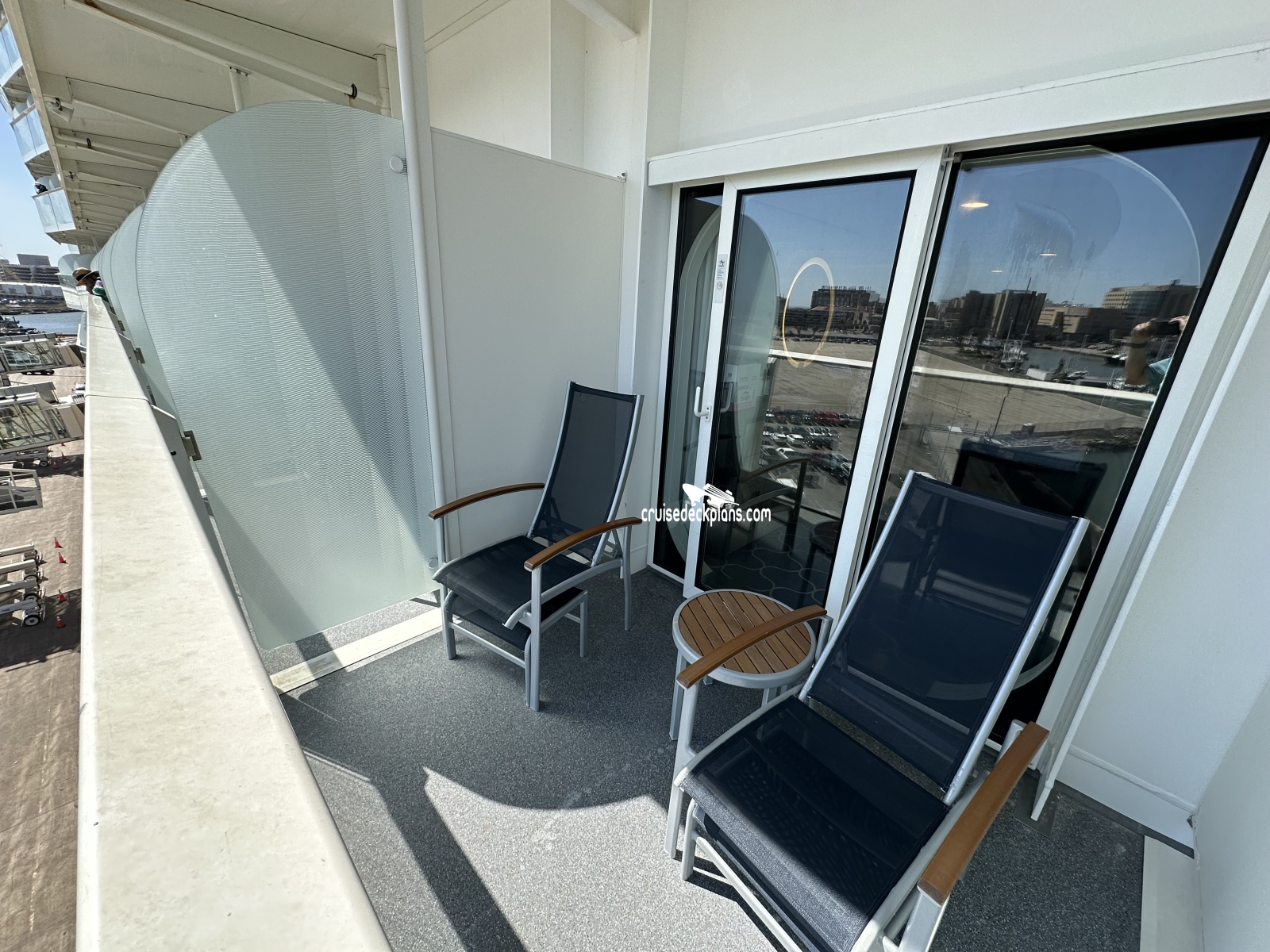 Some balconies up to 80 square feet. Category 1C (was D1) and 2C (was D2) has larger balconies. Some cabins are laid out with the bed near the balcony, others have the sofa near the balcony. Triple and Quad cabins have the sofa near the balcony. Layout changes every other cabin. Handicap cabins may have small chair bed instead of sofa bed. If there is more than two booked in cabin the chair bed is not recommended for adults.
