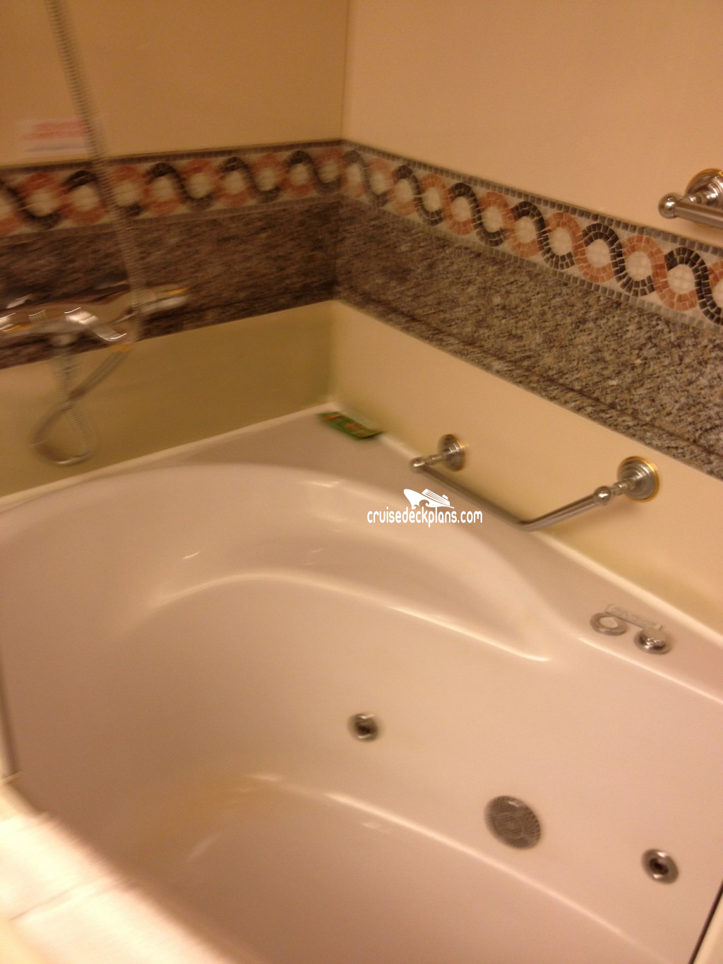 Stateroom 6182 is modified for wheelchair users. The bathroom has a roll-in shower, whirlpool tub, toilet and 1 sink; the suite does not have a walk-in dressing area with a vanity table, sink and chair nor a bidet in the bathroom.
