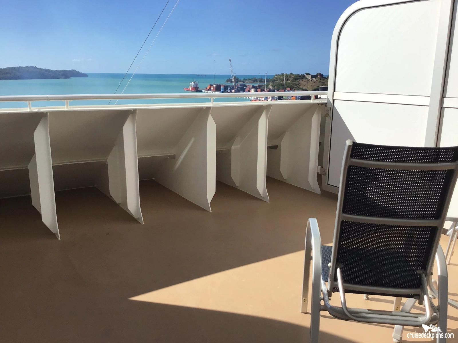 IMPORTANT NOTE: Category DV, DW, DZ have obstructed views due to solid steel railings or tops of lifeboats. Category DZ upper deck balconies can only be used while in port. When upper berth or sofa bed is used it will block balcony. Cabin sizes with balcony ranges from 233 to 291 square feet. Category DV is 253 square feet. Category DZ is 263 to 291 square feet including balcony. Category DB, DC, DD, DE, DF, DW are 233 square feet. Category DA is 249 square feet.