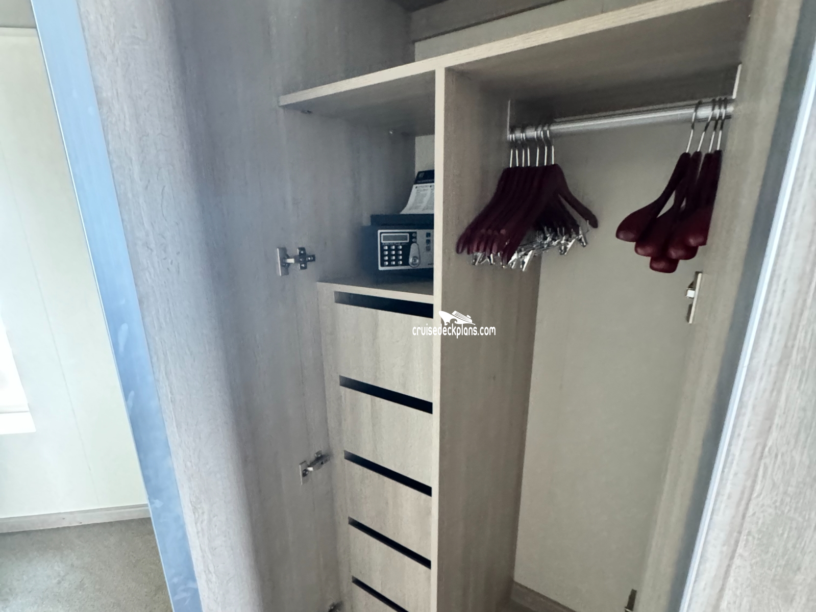 Size shown is for Category S1. Category S2 is 319 square feet plus 79 square foot balcony. Category S3 is 298 square feet plus 102 square foot balcony. Some Sky Suites can combine with nearby Sunset Veranda to create Sky Family Suite (Category SF)