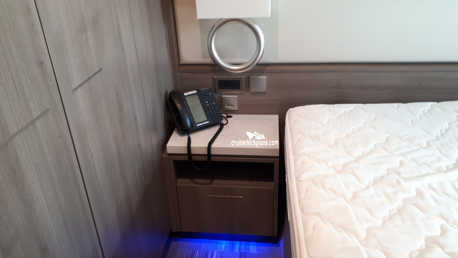 - Porthole window in bedroom overlooking bow of ship and small side balcony