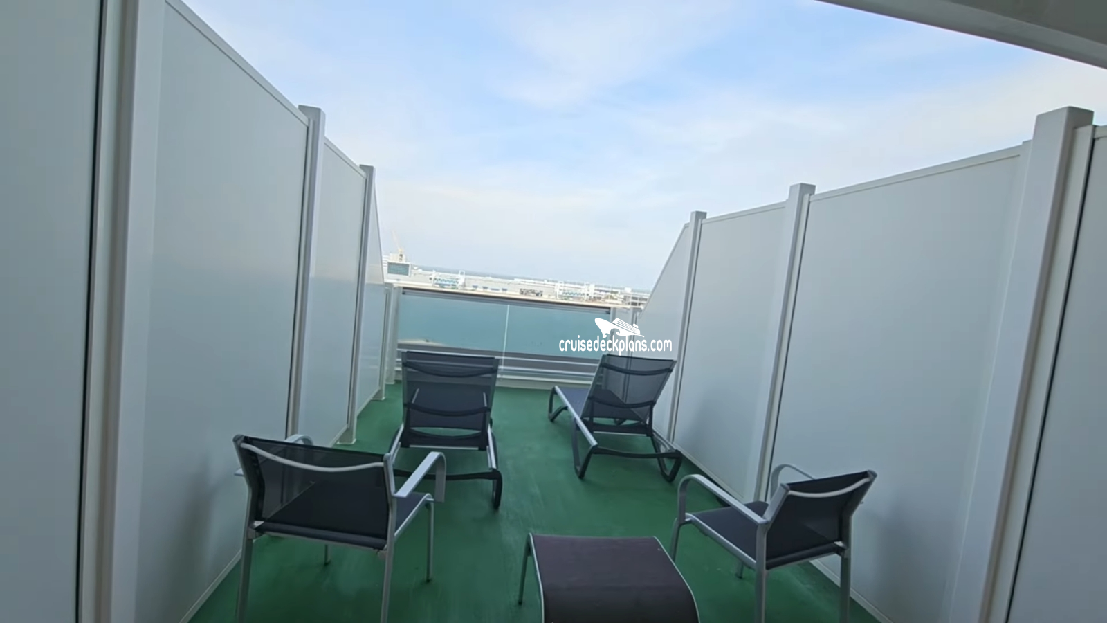 Deck 9 category S3 cabins on port and starboard side will have balcony partitions that do not extend all the way to the railing. This means that the area around the railing will have dividers (railing height) between balconies. You will be able to see your neighbors balcony.