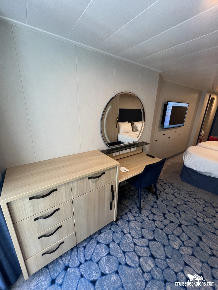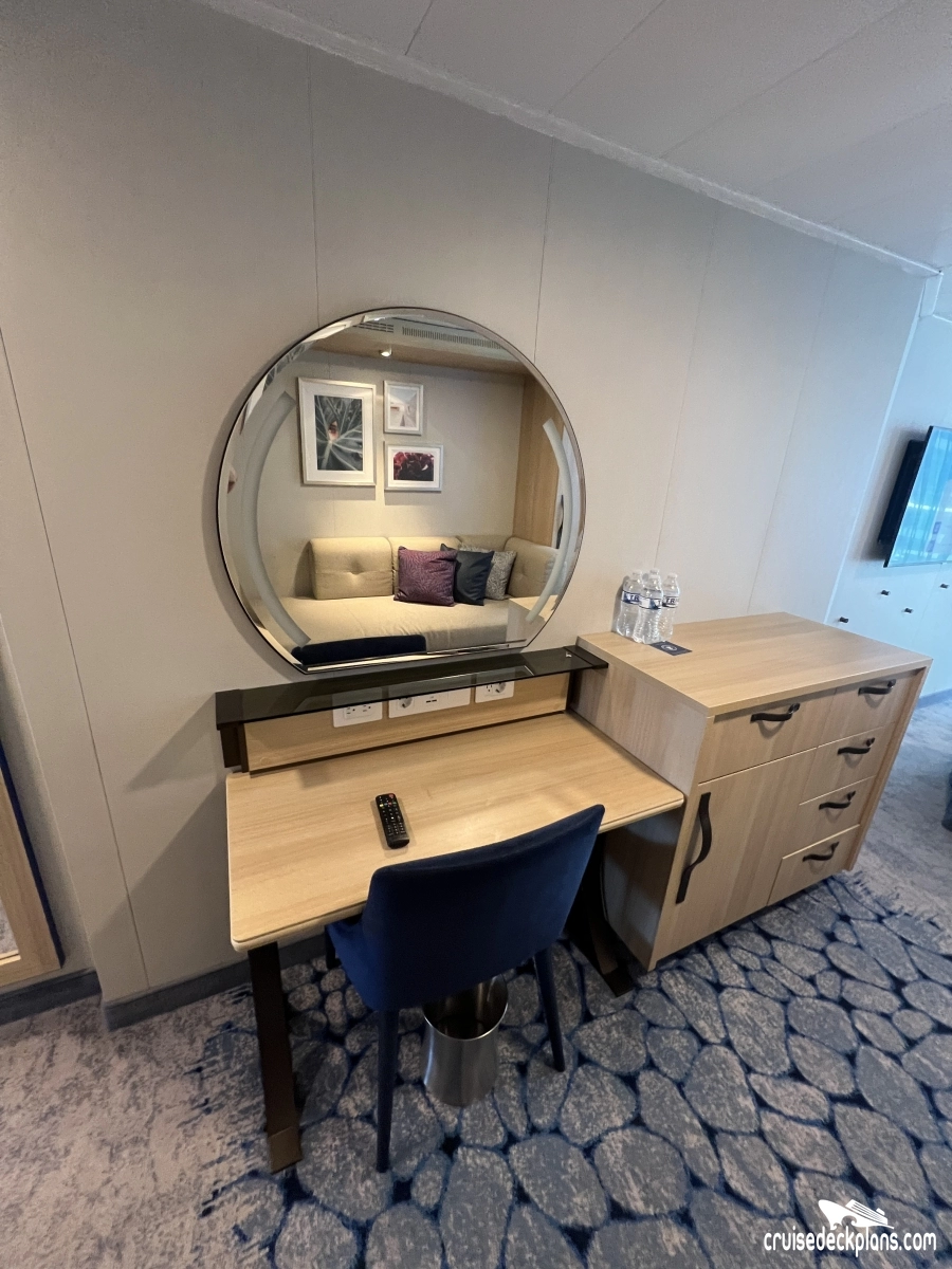 - Expanded living area with desk, drawer space, vanity
