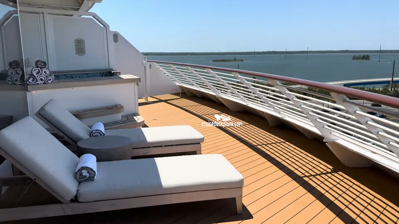 Concierge Service / Priority Check In / Priority Tender Boarding / Dining in the Stateroom / Exclusive Lounge / Priority Dining Reservations / Exclusive Outdoor Lounge / Thick Cotton Robes / Pillow Menu / Sealy Posturepedic Euro-top mattress / Frette 100% Egyptian cotton linens / 2 LCD 42 inch HD flat screen Tvs / Ipod docking station / Enhanced line of H20 Plus spa products / Media library / Pre-arrival concierge services /