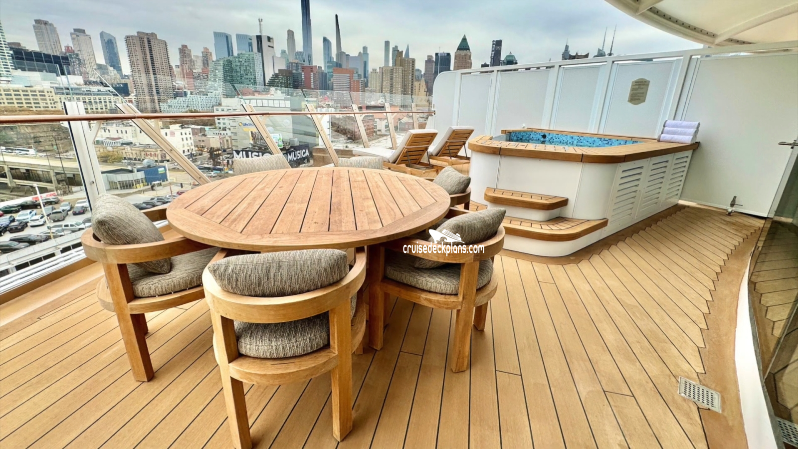 Concierge Service / Priority Check In / Priority Tender Boarding / Dining in the Stateroom / Exclusive Lounge / Priority Dining Reservations / Exclusive Outdoor Lounge / Thick Cotton Robes / Pillow Menu / Sealy Posturepedic Euro-top mattress / Frette 100% Egyptian cotton linens / 2 LCD 42 inch HD flat screen Tvs / Ipod docking station / Enhanced line of H20 Plus spa products / Media library / Pre-arrival concierge services /