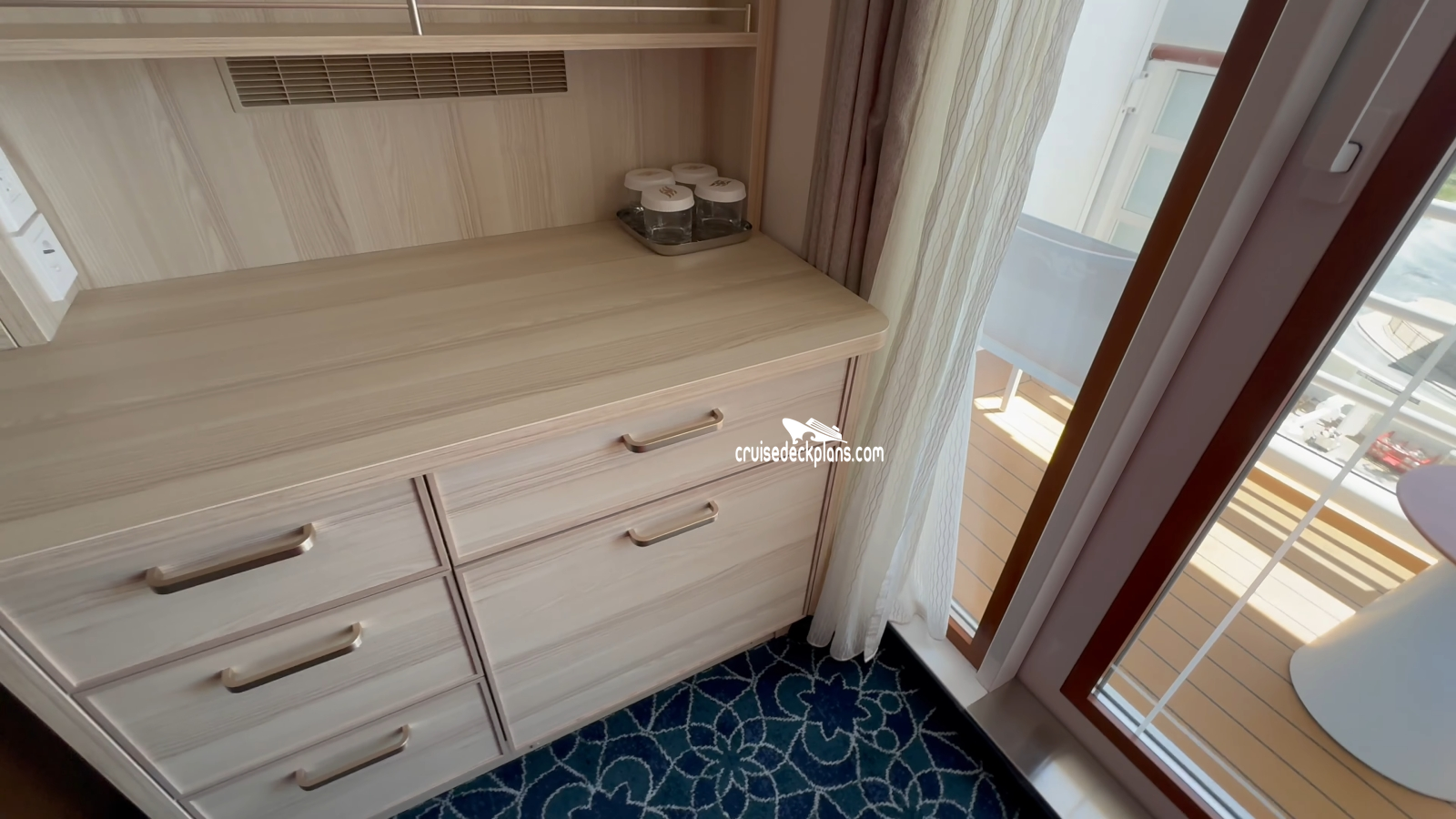 - Private balcony with patio furniture, deck lighting, plexiglas railings and dividers, childproof locks.
