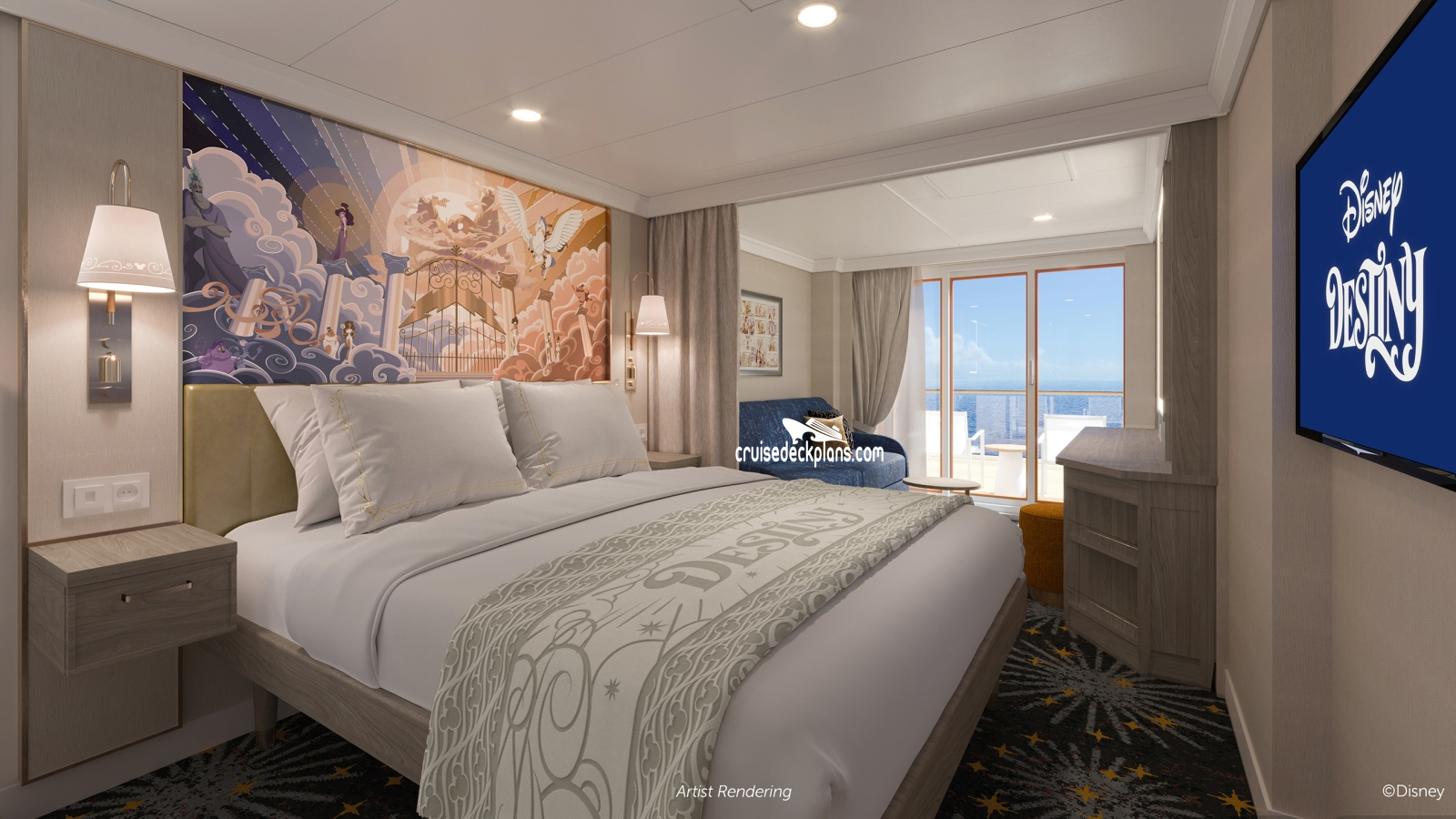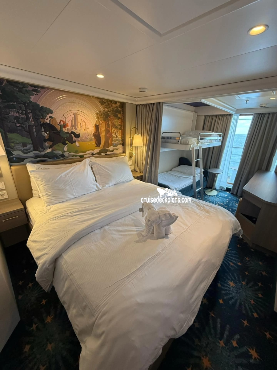 Disney Destiny Deluxe Verandah cabin location, stateroom cabin videos, stateroom cabin pictures, floor plans, diagrams, stateroom features and perks. Cruisedeckplans.com also provides links to actual stateroom cabin pictures and videos on this page. You can see details and floor plans for all of Disney Destiny's different stateroom cabin categories on the NEW cabins page.
